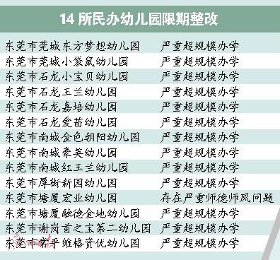 从市教育局发布的年检结果表格中,记者发现,9所年检不合格的民办学校及幼儿园分别分布在虎门、万江、长安、黄江、清溪、常平、横沥等镇街。而限期整改的14所均是民办幼儿园,分别分布在莞城、石龙、南城、厚街、塘厦、谢岗等镇街,它们的问题绝大多数是超规模办学。