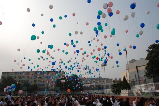 典礼最后,在主持人的倡议下,全校师生纷纷拿起手中的彩笔,在气球上写下自己的梦想,一起放飞!望着绚丽的天空,由衷祝愿,祝愿新中的孩子们能飞得更高,走得更远;祝愿新中的老师们在教学之路上不断采撷硕果;更祝愿新桥路中学明天更加辉煌!