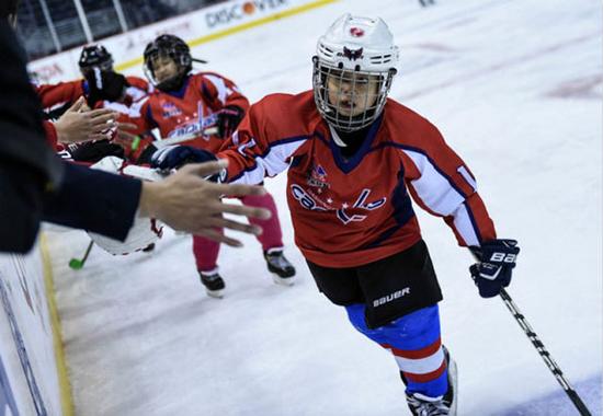 2017年2月1日,在华盛顿首都人队官方冬令营中国文化之夜活动中,来自北京中关村二小 、中关村三小的小球员们在与华盛顿当地青少年冰球小球员们的交流比赛中进球后与教练击掌庆祝。