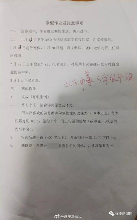该家长介绍,自己孩子在某中学读五年级,1月16日正式放假,老师给每个学生发了一张写有寒假作业内容的纸,列有数项假期作业,但第5条内容看得不是很明白,网友图片显示,这条作业要求是“基础差,自愿去×××教育补习的同学,以补习作业为准。”
