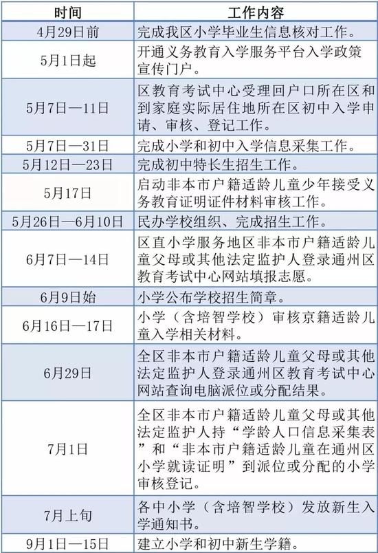 详见附件3《2018年通州区义务教育阶段入学工作时间安排》。