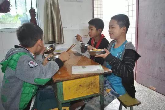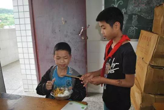 除了如厕外,每天的午饭,也是同学袁孟希为他端来。从四楼下到底楼,一只手端着他自己的饭,一只手端着明明的饭,除有偶尔特殊情况没来上学,从来没耽误过。每天中午,同学们都一起陪着明明说说笑笑一起吃饭,饭后再把饭碗端回食堂。