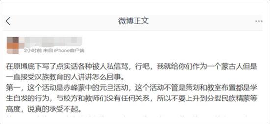 后来,有微博网友以“接受汉族教育的蒙古人”的身份做出“解释”称,这个活动是赤峰蒙中的元旦活动,不管是策划和教室布置都是学生自发的行为,与校方和教师们没有任何关系。该网友还呼吁,不要将事件上升到分裂民族、精蒙等高度,“说真的承受不起”。
