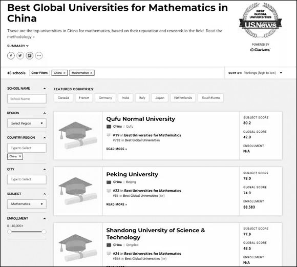 全球四大高校排行榜之一的《美国新闻与世界报道》(US News,以下简称《美国新闻》)公布的最新世界大学排名中,曲阜师范大学超越北大成为“中国最佳数学学科排名第一”,在学界引发争论。事实上在全球各种权威排名上,各国高校都面临数据真实性的争议。对于想要出国留学的学生来说,要怎样才能获得“真实”的排名信息?而对于校方来说,要怎么做做才能避免外界对其“刷分”的猜疑?