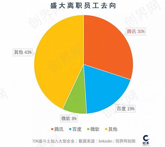 自主创业占了7%,70%的盛大离职员工加入了大型公司。他们活跃在在互联网的企业服务、游戏、文娱、硬件、电商、社交、教育、广告等各个领域中奋斗。其中腾讯百度阿里所占的比例分别为30%、19%、8%。众多盛斗士在成为BAT员工后,依托更大的平台,在中国互联网行业释放出更大的能量。
