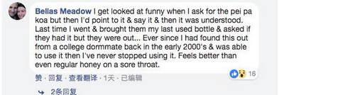 “每次我在中国药店说我要枇杷膏的时候,他们都听不懂我说啥!我只能指出来。但是在上次,我又去买的时候,他们告诉我已经售罄了。2000年左右我从大学室友那里听说并第一次试过了枇杷膏之后,我就根本停不下来了!这个比蜂蜜缓解咳嗽的效果要好很多。”