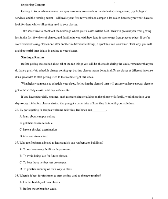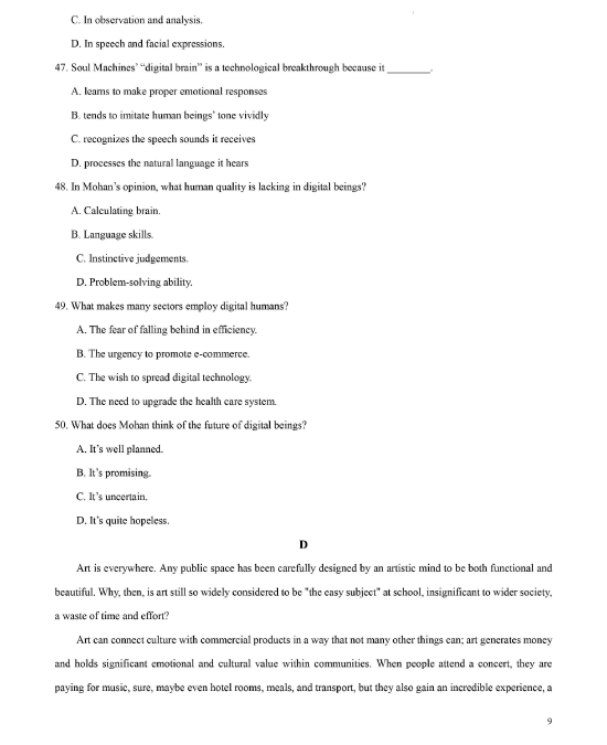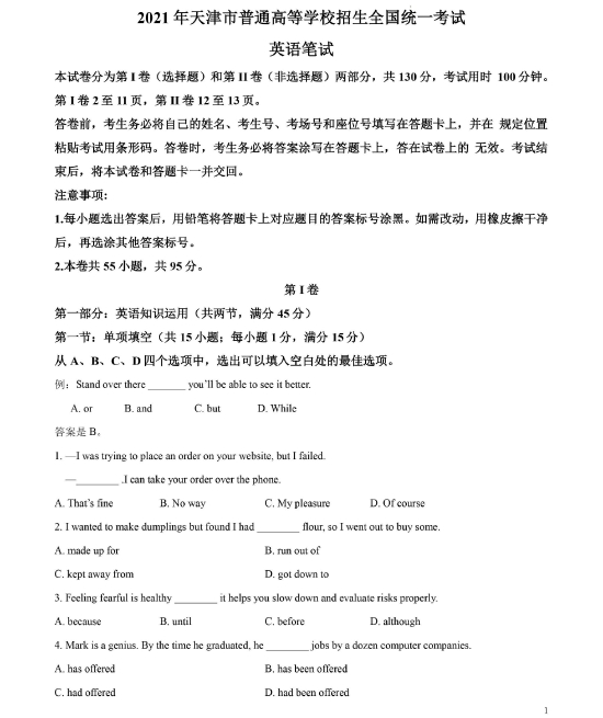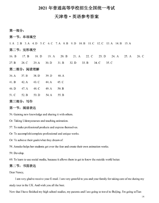 2021年高考英语试题及参考答案(天津卷)