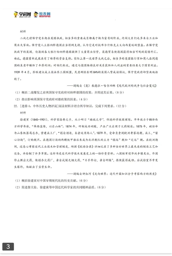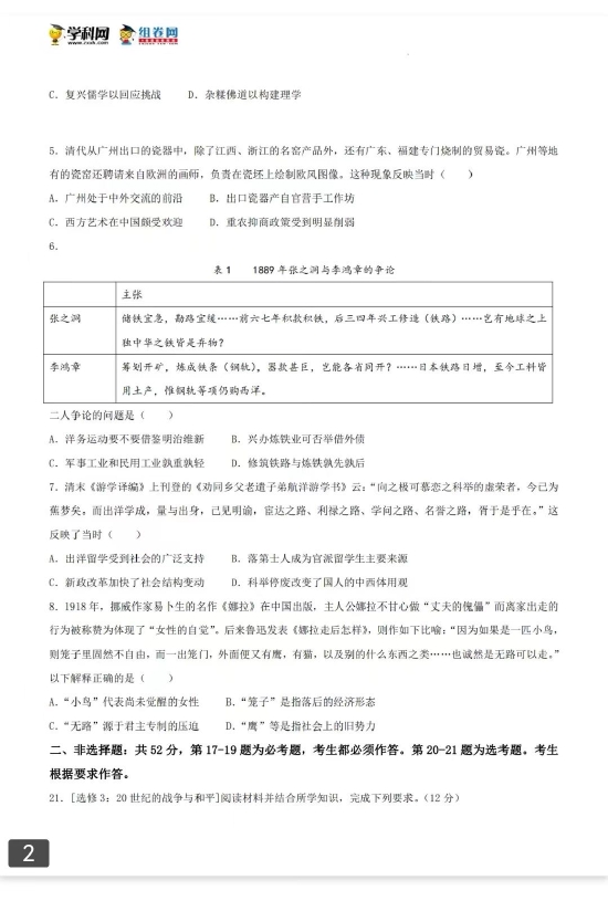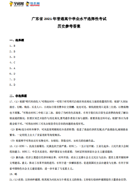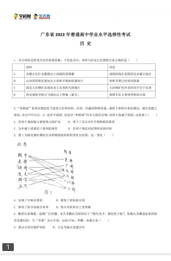 考试已结束,以下为2022高考历史真题及参考答案(广东卷)。