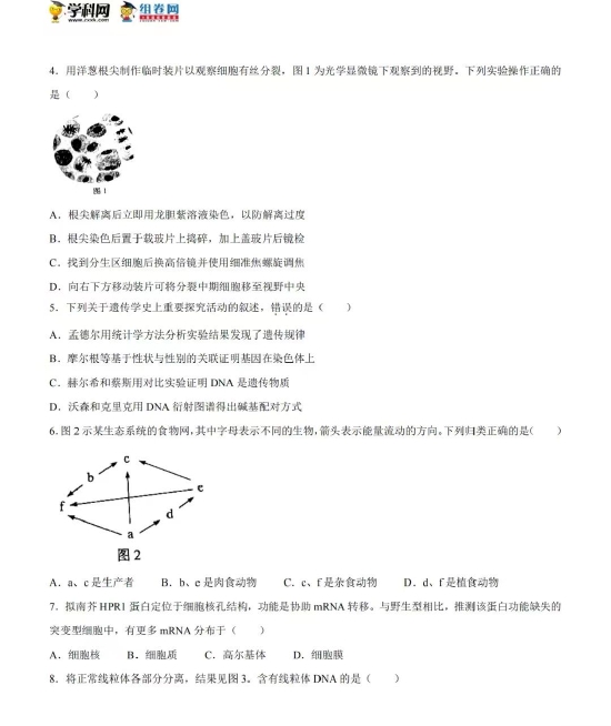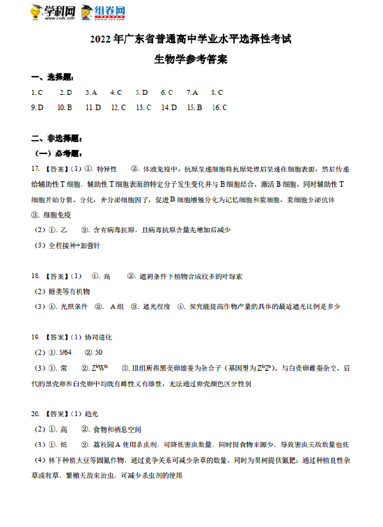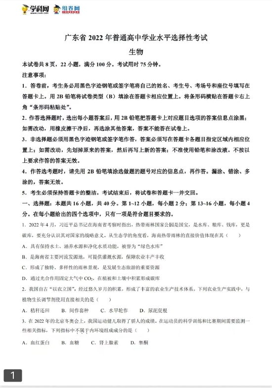考试已结束,以下为2022高考生物真题及参考答案(广东卷)。