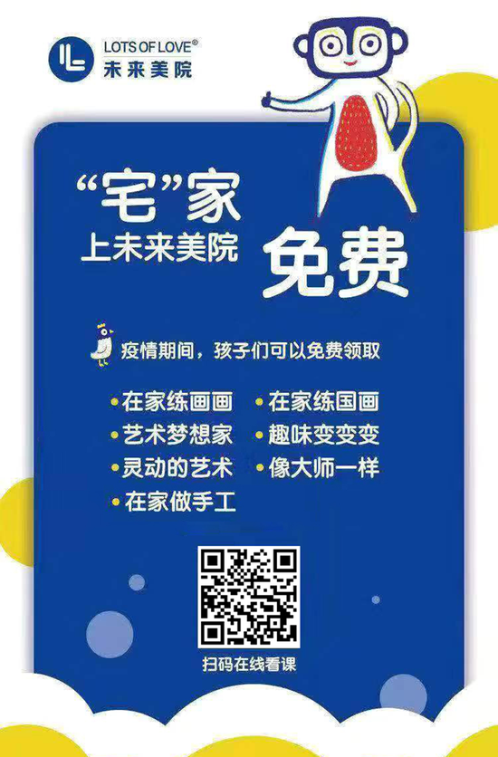 未来美院多年来一直致力于“互联网+美育”内容、产品、课程的研发。希望这些有趣的亲子美术课程,能够帮助家长和孩子们摆脱恐慌,度过一段充实、快乐的家庭时光。病毒虽无情,但阻挡不了孩子们的向上之心,更扰不乱全国人民对抗的决心。