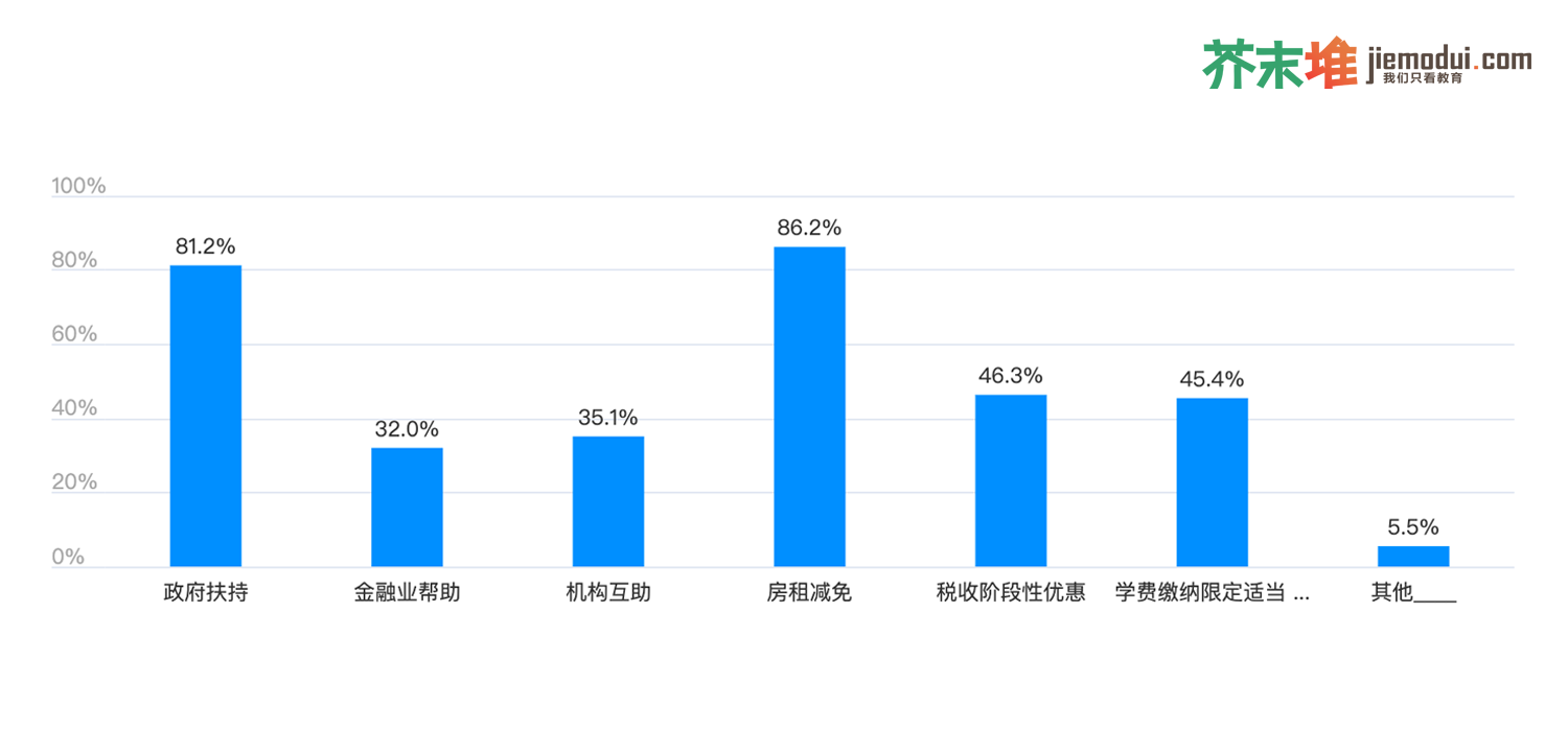 调查显示,有86.2%和81.2%的教育公司分别分别表示需要房租减免帮助和政府扶持。同时,还有46.3%和45.4%的企业也分别表示需要税收阶段性优惠和学费缴纳限定的适当放宽。