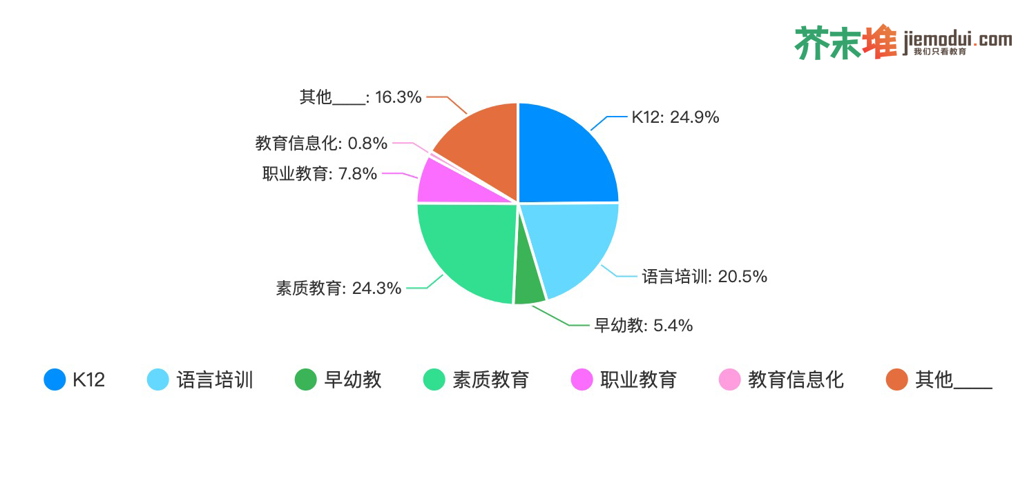 在调查中的1726家教育公司中,有24.9%为K12教育公司、24.3%为素质教育公司、20.5%为语言培训公司、7.8%为职业教育公司、5.4%为早幼教公司、0.8%是教育信息化公司,此外还有16.3%的其他类型公司。