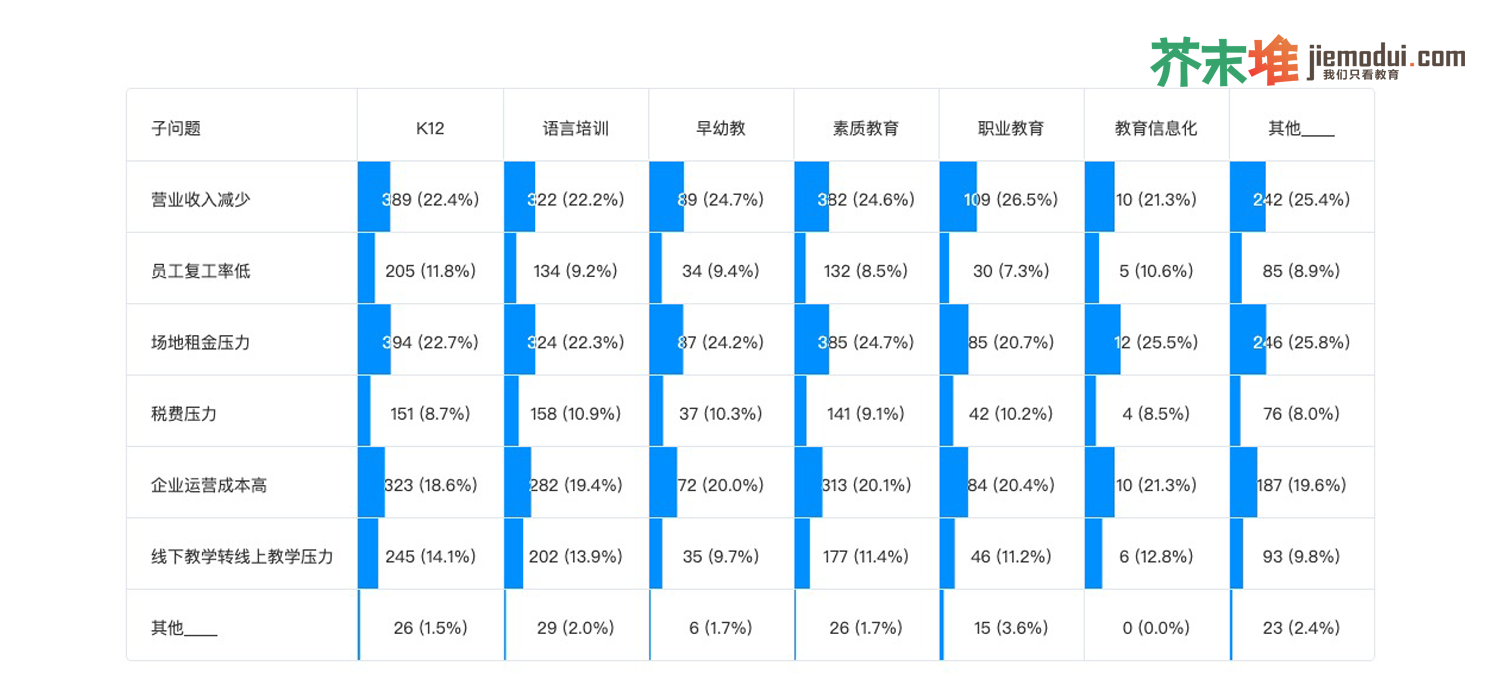根据调查,除营业收入减少外,不同赛道教育公司们普遍面临的难题都是场地租金压力,和企业运营成本高企。同时,K12、语言培训、素质教育、职业教育等领域多数企业还面临线下教学转线上教学压力。