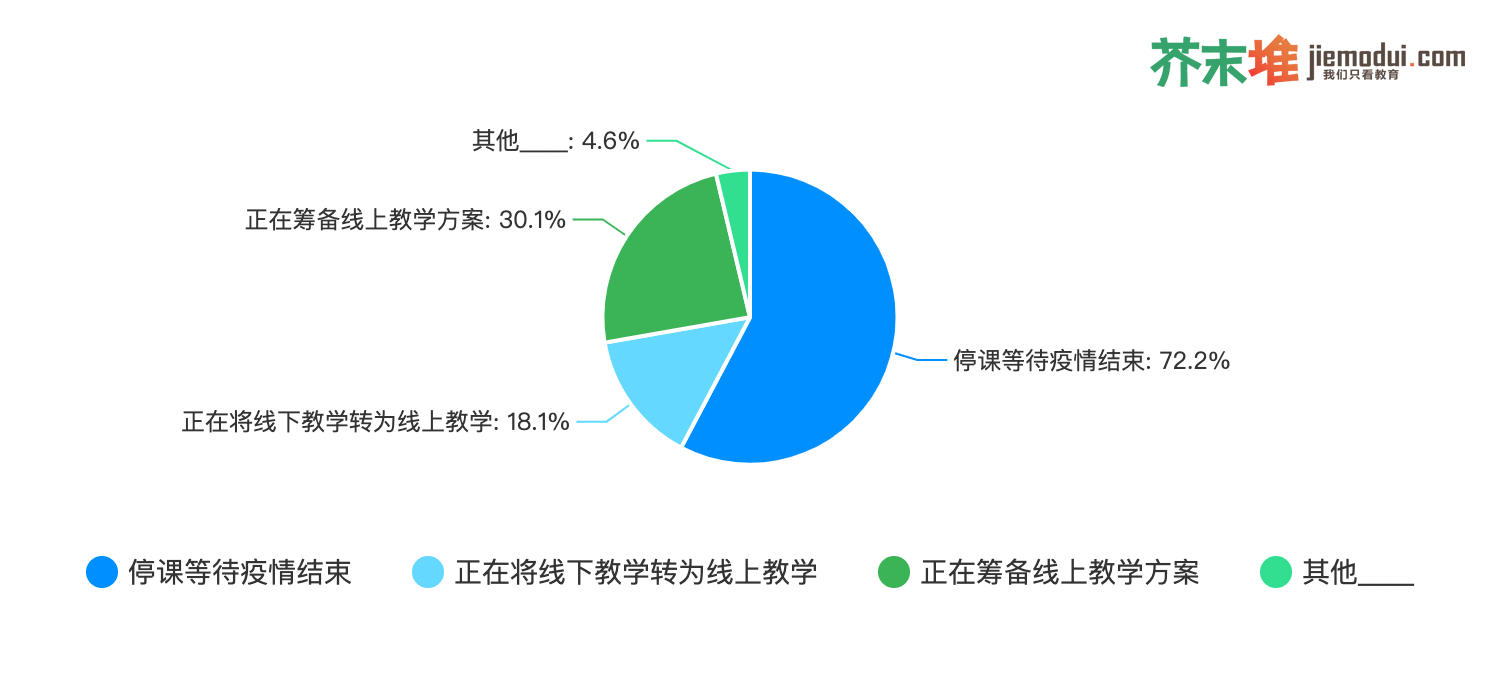 面对教育部及各级教育主管部门对停止线下教学活动的要求,有72.2%的调查企业表示,正在停课等待疫情结束。与此同时,有18.1%的调查企业表示正在将线下教学转为线上教学,还有30.1%的企业表示正在筹备线上教学方案。