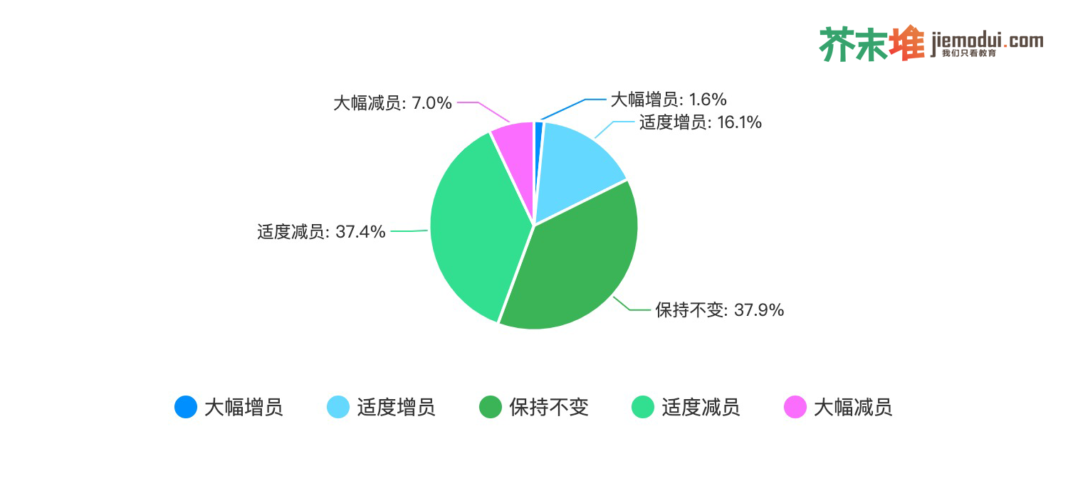 2020年Q1季度和上半年营收预期对比表明,随着疫情逐渐好转,和对在线模式转化的成功,教育公司的经营状况或许有所好转。根据调查,有37.4%的教育公司表示将会适度减员,其中有7.0%的教育公司表示将会大幅减员。此外,还有37.9%教育公司表示将保持不变,此外还分别有16.1%的教育公司表示会适度增员,和1.6%的教育公司表示会大幅增员。