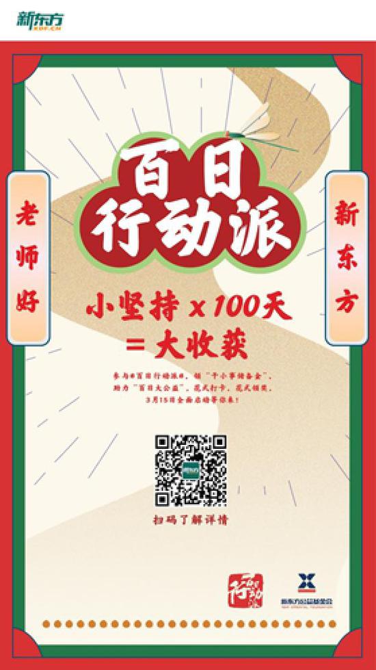 新东方希望在优秀发起人的带领下,参与者通过一百天的努力,获得实实在在的改变和提升,同时,用一百天养成好的习惯,让自己能够不自觉地坚持下去。更重要的是,在这个过程中体会到“坚持”本身的乐趣和力量。