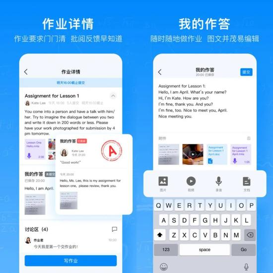 老师可通过「腾讯作业」平台布置作业,学生在移动端「腾讯作业君」上提交作业,并汇总到教师产品端,教师可线上客观题自动批改、主观题智能识别辅助批改,并提供英文口语评测、作文智能批改等AI服务。
