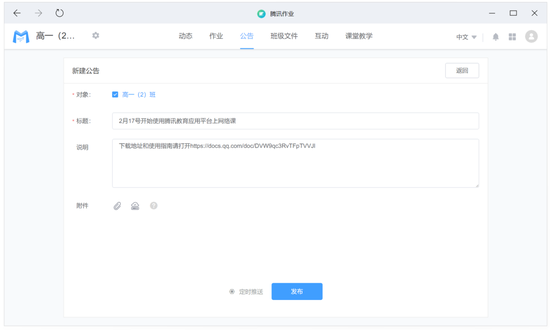 老师可通过PC端的「腾讯作业」发布班级通知和公告。