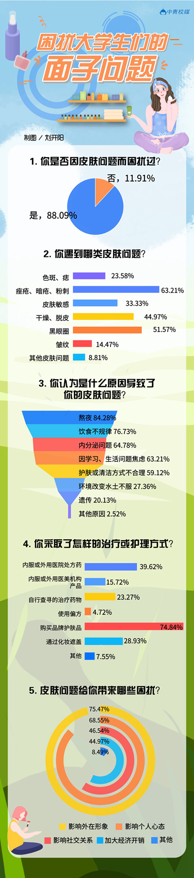中国青年报社和丁香医生对全国40所高校的12117名大学生发起调查,并发布《2020中国大学生健康调查报告》,结果显示,皮肤状态不好,是困扰大学生的首要健康问题(45%),高于睡眠不足(42%)、情绪问题(38%)、脱发(30%)、肥胖(22%)等。中青校媒的进一步调查显示,88.09%被调查大学生或多或少地担心过自己的皮肤状况。