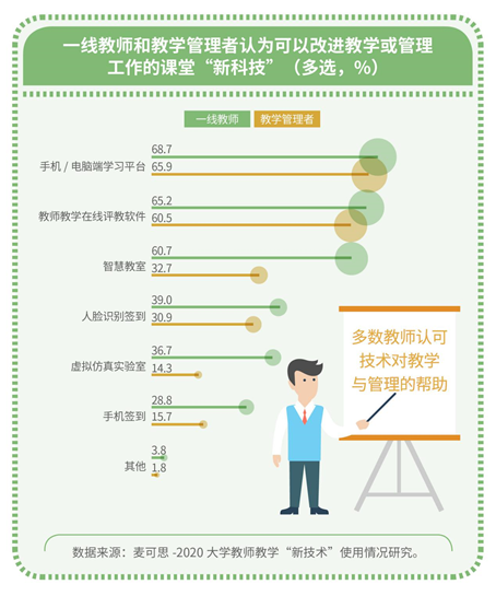 随着高校陆续恢复正常教学秩序,圆满完成了在线教学支持任务的手机、电脑等电子设备还能进入课堂辅助学生学习吗?麦可思最近通过问卷收集了536名高校教师对科技与教育“联姻”的看法。