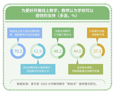研究显示,接近八成的教师认为,兼顾线上和线下教学特征的混合式教学应当获得学校支持,例如制定线上线下混合式教学政策,鼓励教师在后疫情时代开展在线教学等。此外,将在线教学纳入绩效考核范畴是不少教师的“心声”,48.2%的教师希望学校能完善在线教学工作量的计算方法,超过六成的教师希望学校把在校教学纳入教师评价机制,在晋升、评奖时加以考虑。
