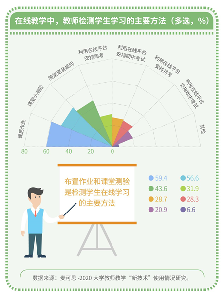 研究结果显示,教师最广泛采用的形式是“课后作业”和“课堂小测验”,使用率超过了五成,而利用在线学习平台组织考试的教师比例较少(周考:31.9%;月考:28.3%;期中考试:28.7%;期末考试:20.9%)。