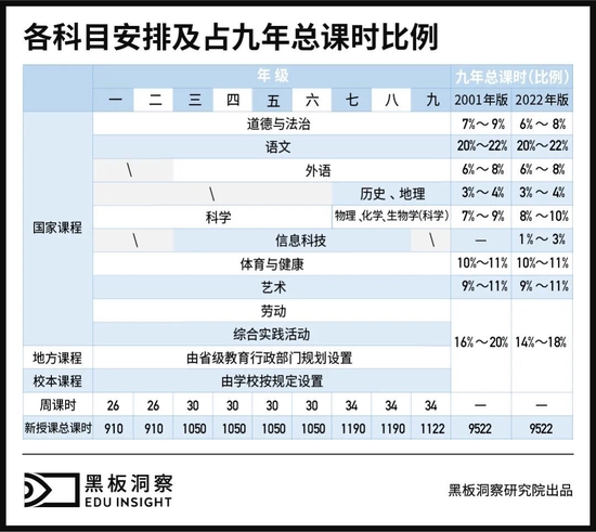 不论是历经时代变迁还是“双减”等政策要求,义务教育阶段九年 9522 节总课时都未曾改变。以上种种优化设置都是在总课时不变的基础上完成,仅在各科目占九年总课时比例上作出调整。