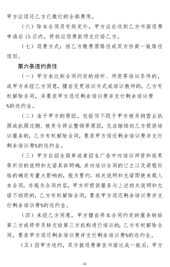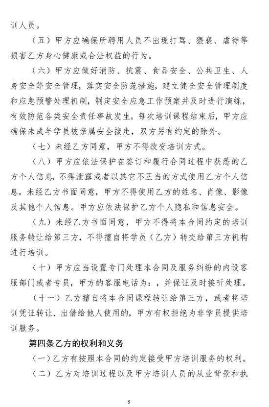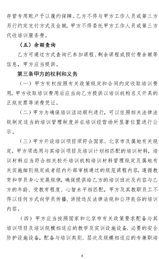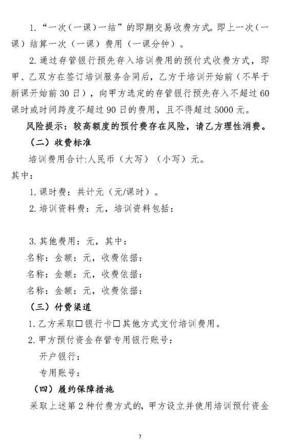 第七条 文化艺术类校外培训机构提供培训服务,应参照《北京市营利性文化艺术类校外培训服务合同》(示范文本),与学员(包括未成年学员监护人或成年人学员,下同)签订书面合同文本,并按照合同约定及相关规定办理收费和退费事宜,保障学员合法权益。文化艺术类校外培训机构应当清晰、全面、明确地告知学员订立合同的步骤、注意事项、收费项目、收费方式、退费办法等事项,并保证学员能够便利、完整、充分地阅览和理解。对涉及学员义务或文化艺术类校外培训机构权利的内容,文化艺术类校外培训机构应当以显著方式进行提示。