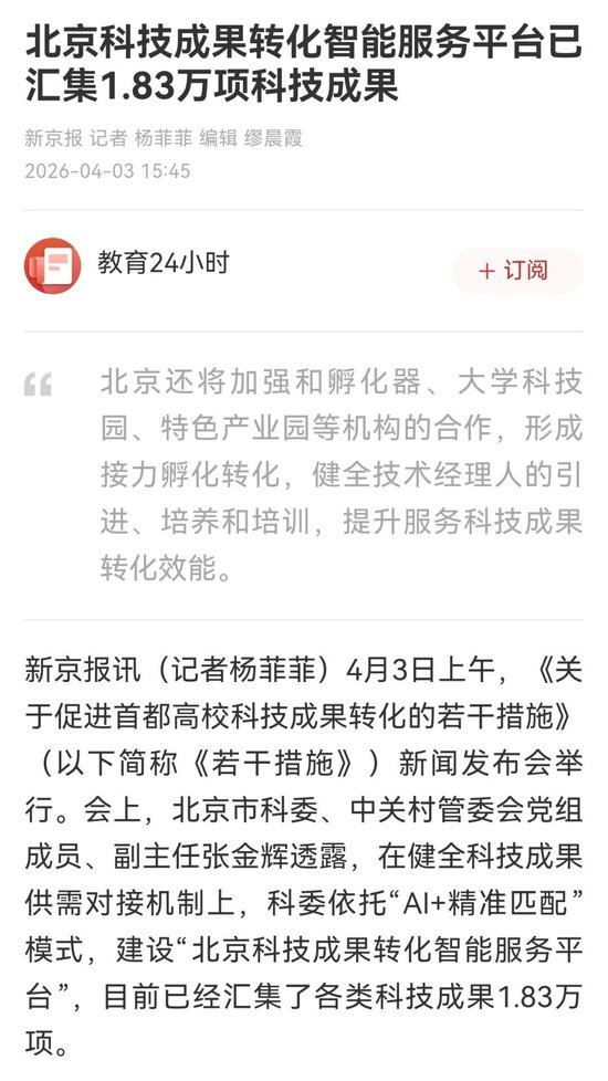 新京报:北京科技成果转化智能服务平台已汇集1.83万项科技成果